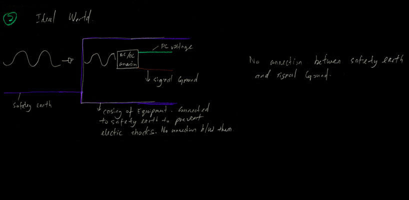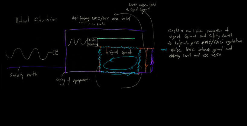 However, in the real world, for cost and/or expediency reasons, for example to pass EMI/EMC regulations, the safety earth and signal ground are electrically connected. This causes earth noise to leak into signal ground and high frequency EMI/EMC noise to leak into Earth.