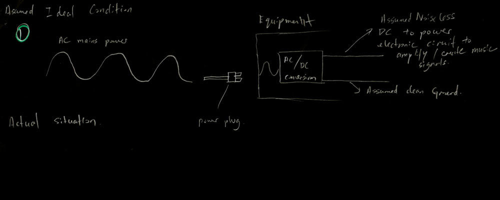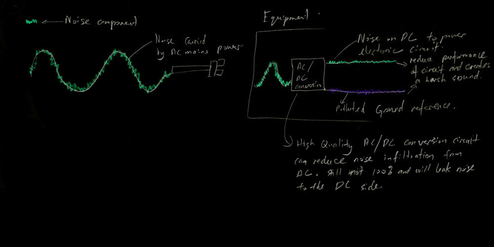 In reality, AC mains are noisy, and this noise will leak into the DC power supply and subsequently, into the audio signal that you hear. In conventional electronic circuit design, steps are taken to reduce this noise, but it remains insidious and will find its way into your system.