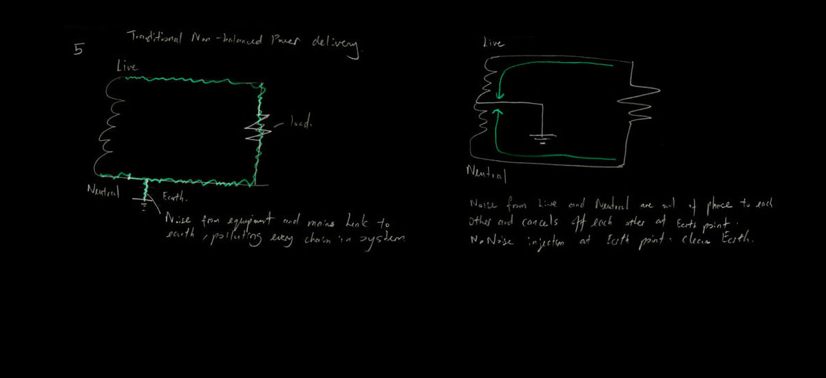 In traditional non-balanced power delivery, noise from equipment and mains leak to earth, polluting every chain in the system.
